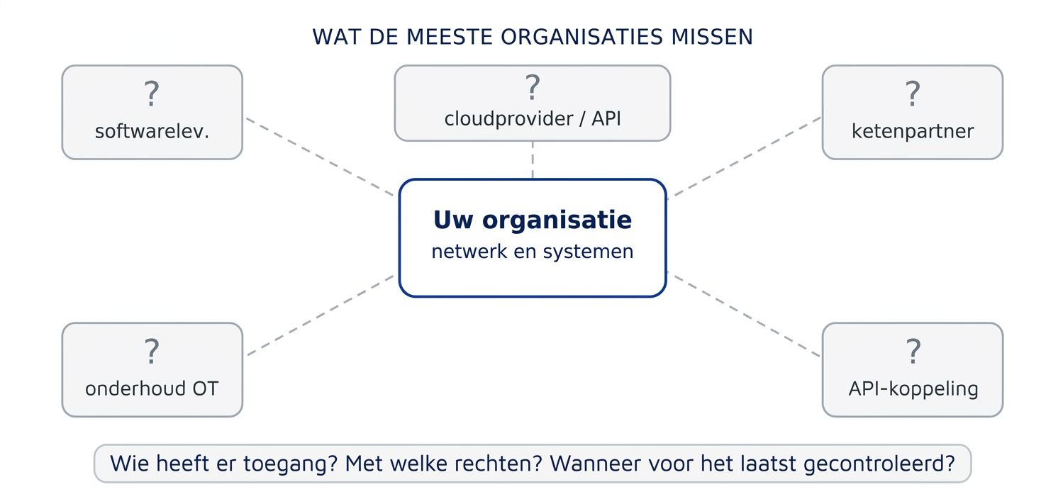 In al deze situaties geldt hetzelfde principe: de grens van uw eigen netwerk is allang niet meer de grens van uw risico. Wie uw systemen kan bereiken, wie uw data kan inzien, wie op afstand wijzigingen kan doorvoeren, al die partijen vergroten uw aanvals oppervlak. Of u zich dat realiseert of niet.