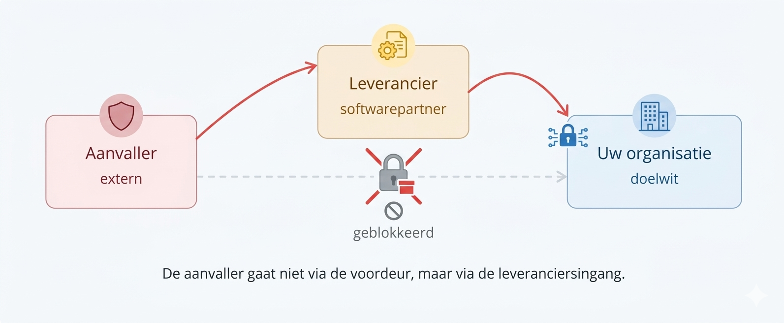 Dat is het wezen van een supply chain aanval. Aanvallers richten zich niet op het doelwit zelf, maar op een partij die er toegang toe heeft. De toegang is er al. Het vertrouwen is al gegeven. Wat overblijft is een opening die aanvallers met beide handen aangrijpen.