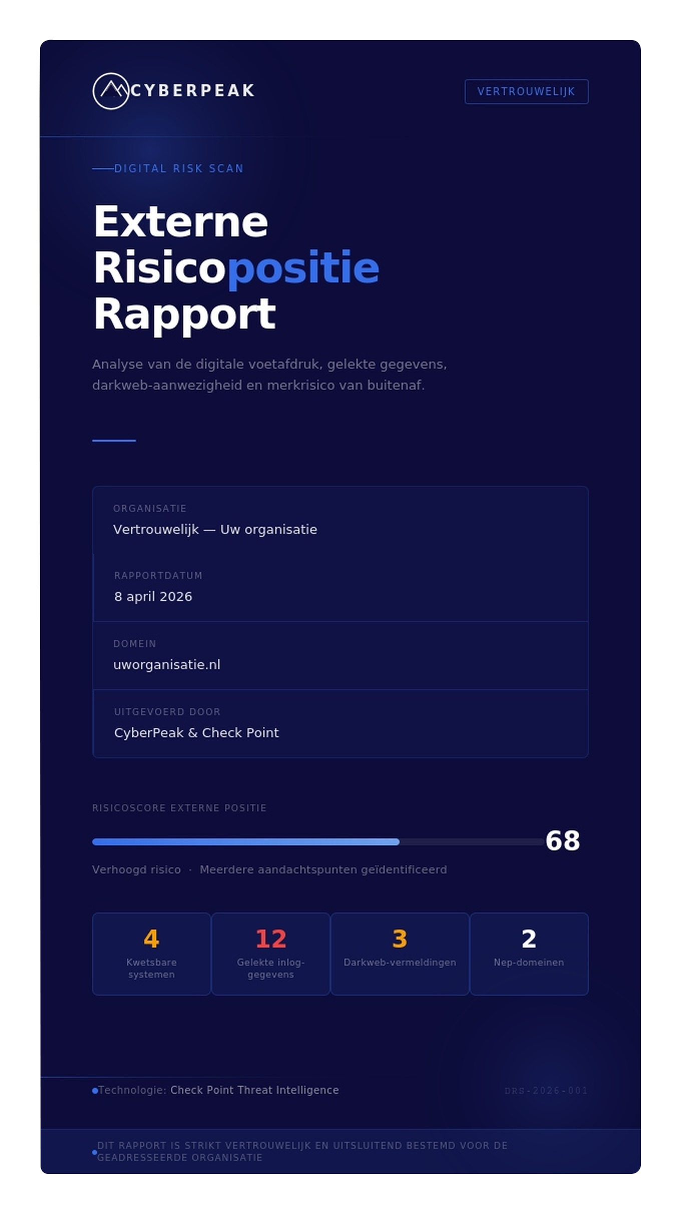 De CyberPeak Digital Risk Scan brengt in kaart wat er vandaag al zichtbaar is, zodat u kunt handelen voordat het fout gaat.